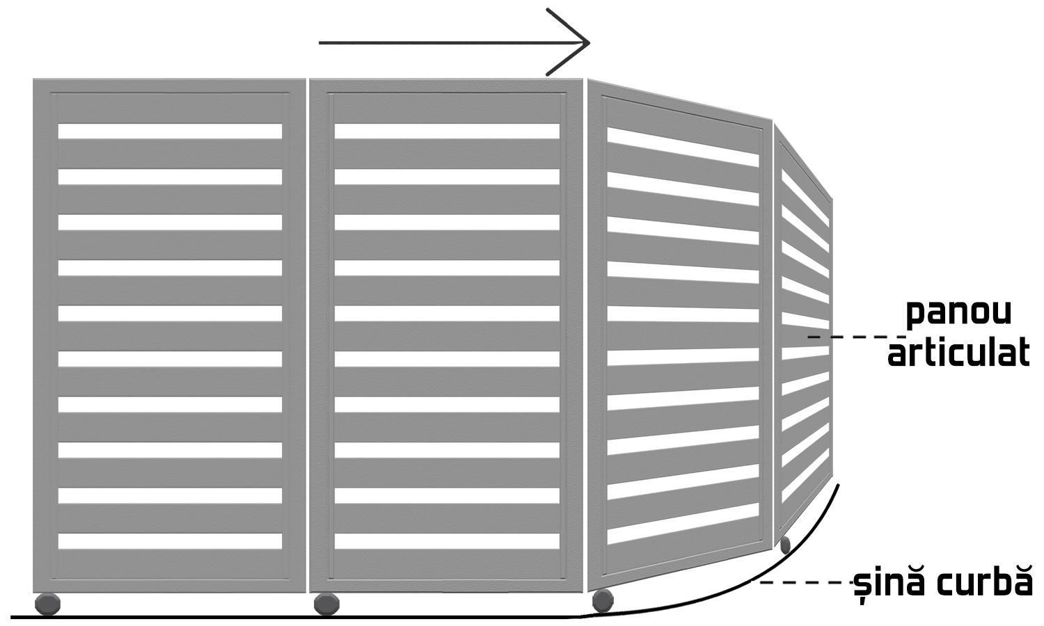 Porta articulată este compusă din panouri articulate între ele, care îi permit să culiseze (să se deschidă) pe o șină curbă. De exemplu, dacă poarta este aproape de colțul curții, se poate monta paralel cu gardul o șină curbată la 90°.