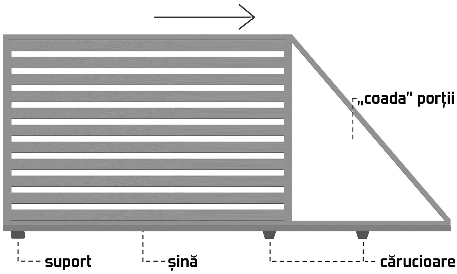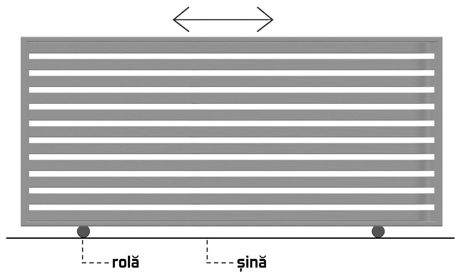 Porțile culisante au montate pe latura de jos role cu care culisează pe o șină fixată pe pavaj sau pe un pat de beton.