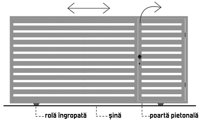 Dacă spațiul nu-ți permite să faci porți separate pentru mașină și pentru pietoni, le putem face pe ambele într-una. Poarta pietonală o montăm în poarta mare.